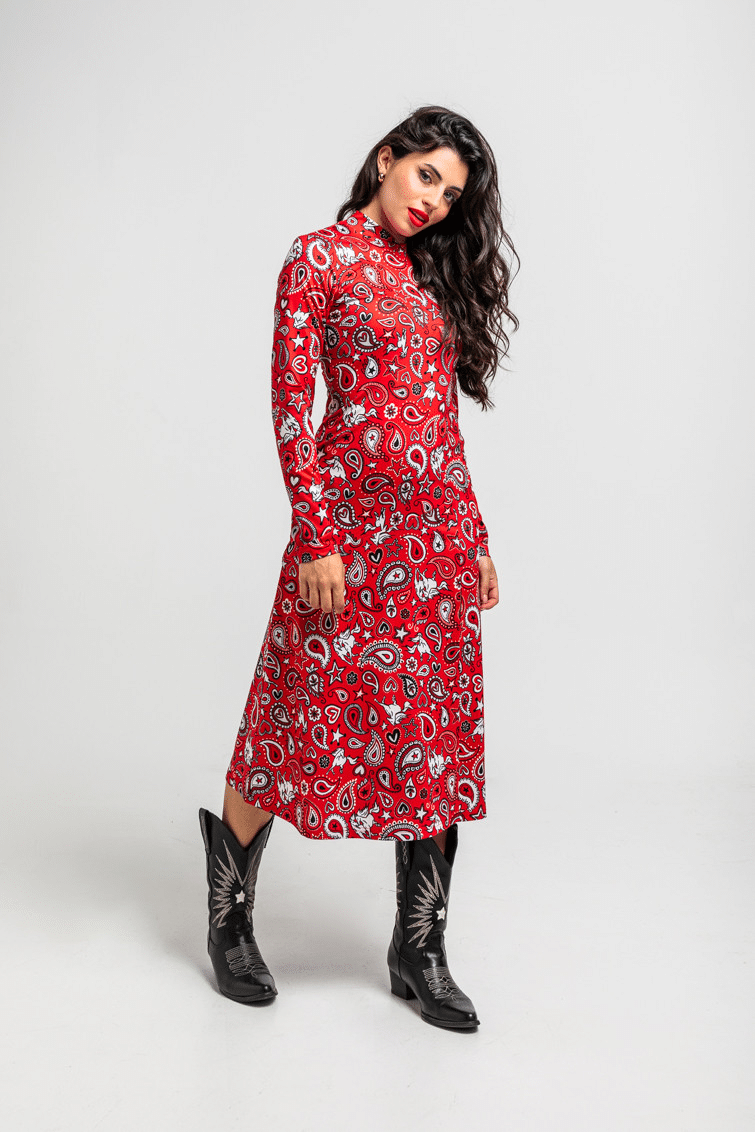 Vestido midi fluido de estampado paisley cachemir rojo - Alma Libre
