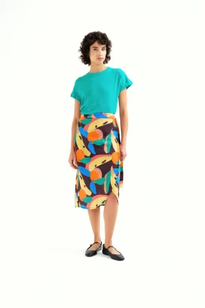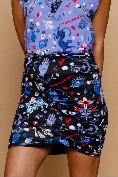 Falda corta de tiro medio. Fruncido en laterales. Efecto drapeado. Estampado místico. Tejido elástico. Forro interior.