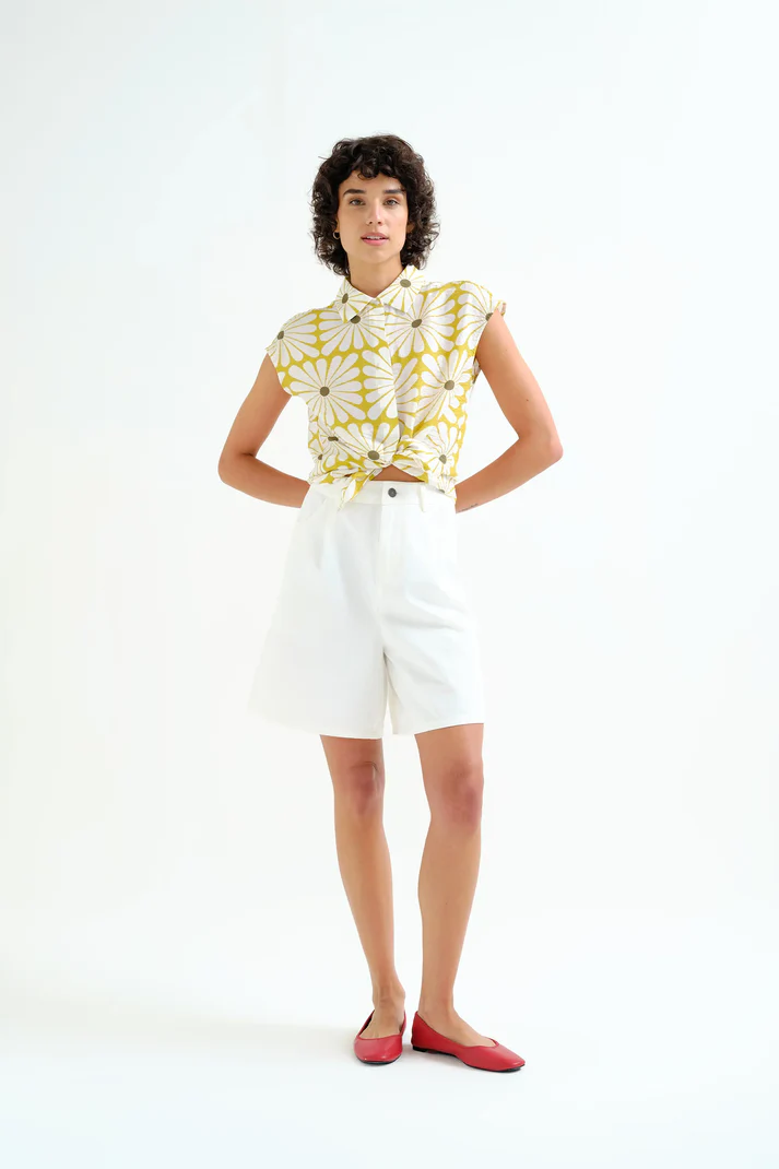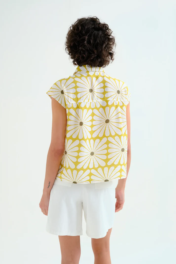 Camisa de tejido crepé con estampado olive flower. Cuello solapa y sin mangas. Cierre frontal con botones ocultos.