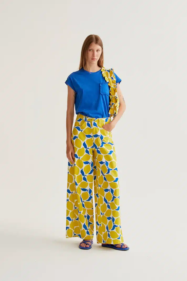 Camiseta con tejido 100% algodón de color azul. Cuello redondo y manga corta. Detalle de bolsillo con volantes.