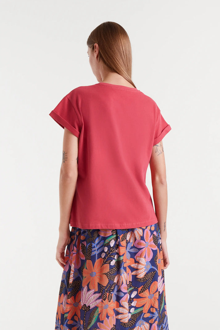 • Camiseta con tejido 100% algodón de color rojo. Con cuello redondo y manga corta con vueltaCOMPOSICIÓN:100% cotton