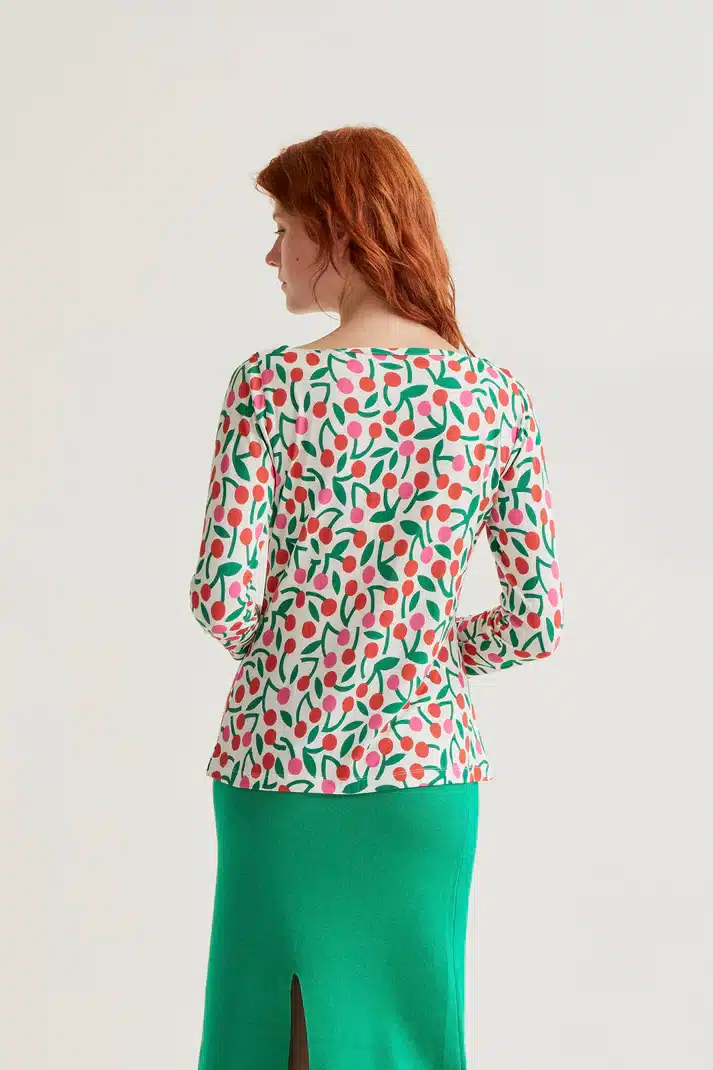Camiseta de tejido jersey viscoso con estampado guinda. Cuello barco y manga larga. Hombros ligeramente caídos.