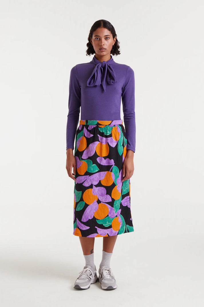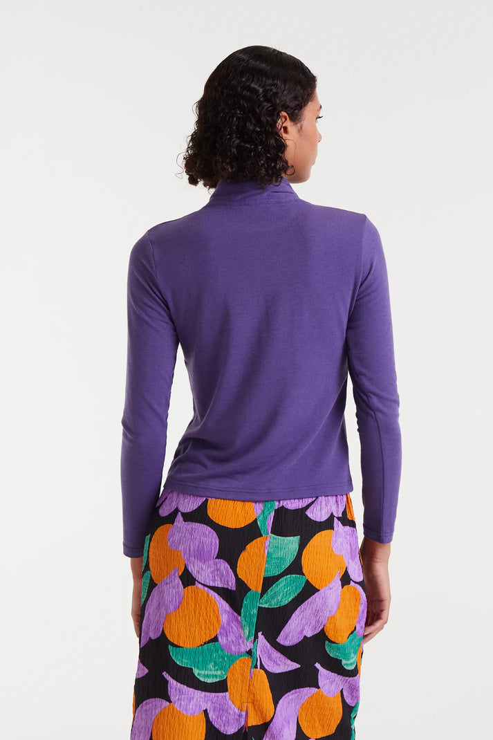 Camiseta con tejido punto ligero de color negro. Cuello alto con lazada y manga larga