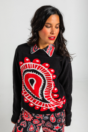 Cárdigan jacquard con estampado Baboushka Big. Con cuello redondo y manga larga. Cierre frontal con botones. Detalles acabados en rib.