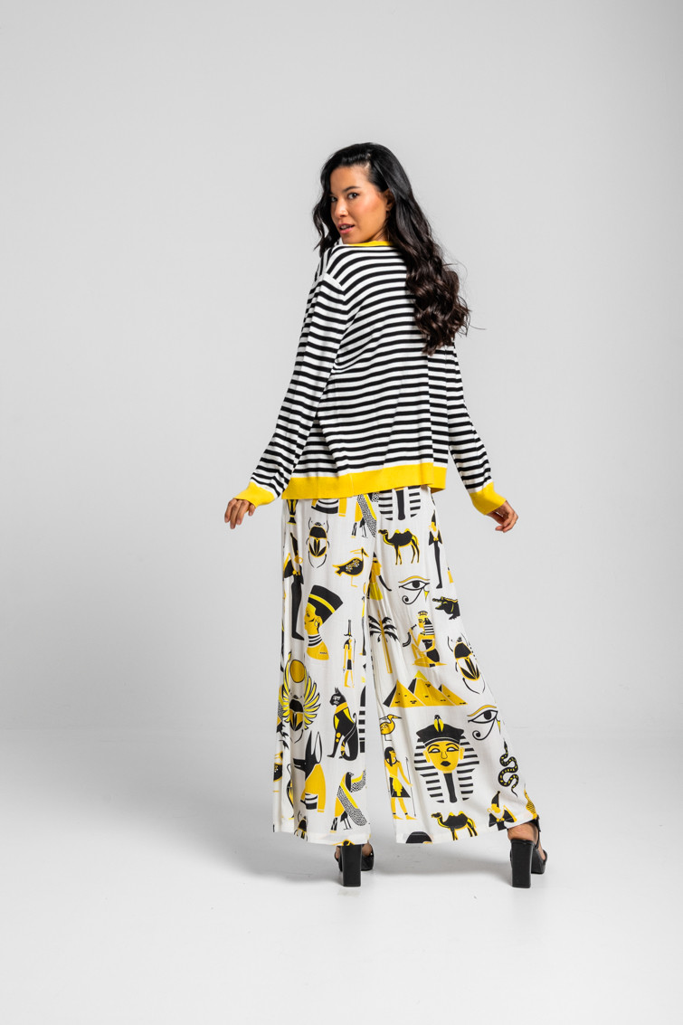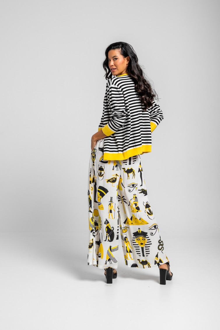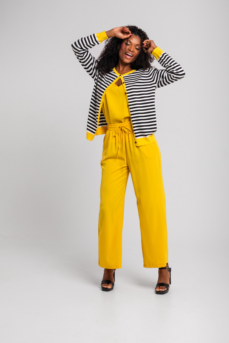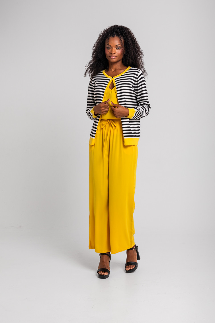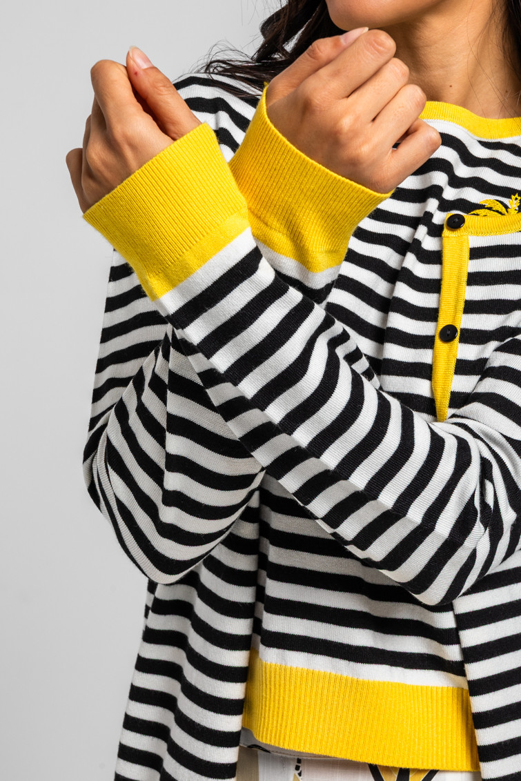 Cárdigan punto fino de rayas blancas y negras: Cárdigan entallado en punto fino suave, cuello redondo ribeteado en canalé y botones. Remate acanalado en puños con abertura y bajo.