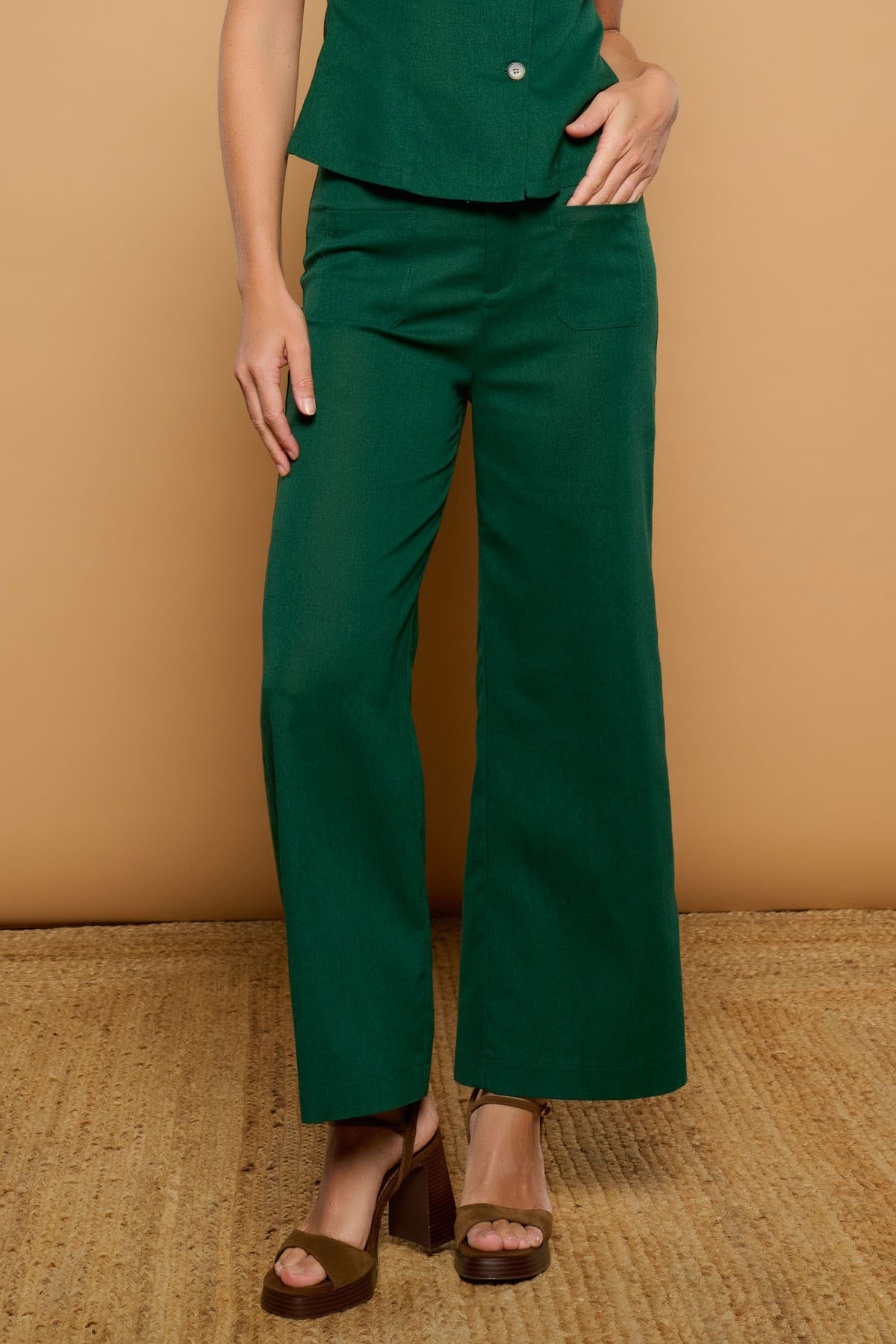 Pantalón de tiro medio y pernera ancha. Tejido fluido mezcla con algodón y lino. Cierre con botón y cremallera frontal. Solapas traseras.