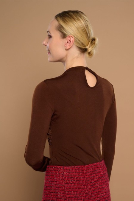 Camiseta ajustada drapeada y cruzada de manga larga y cuello redondo. Tejido elástico. Cierre en espalda con abertura y botón.