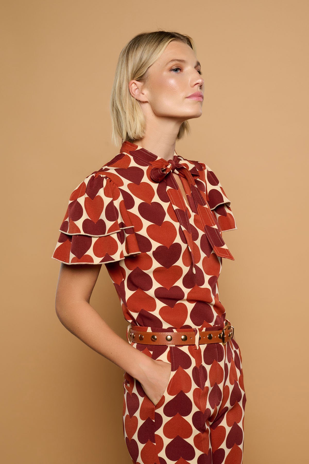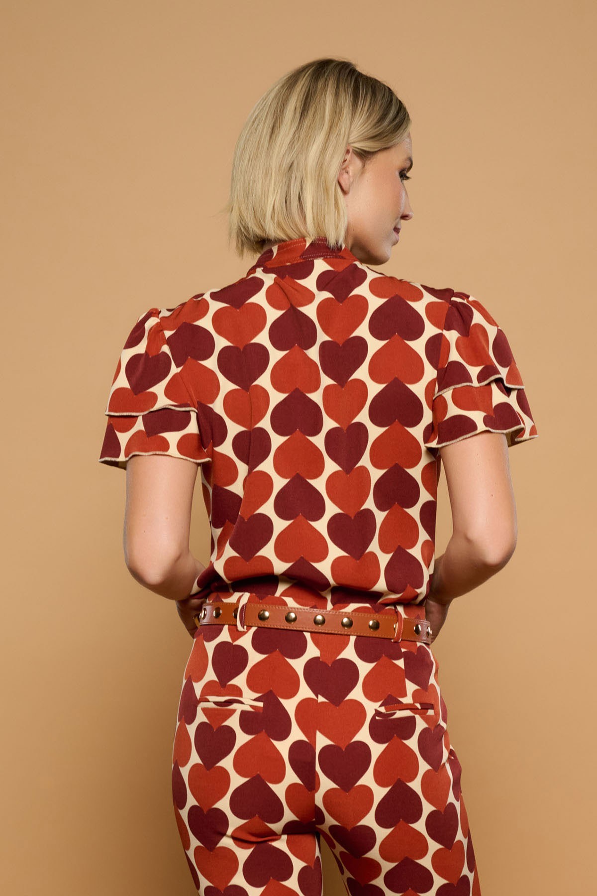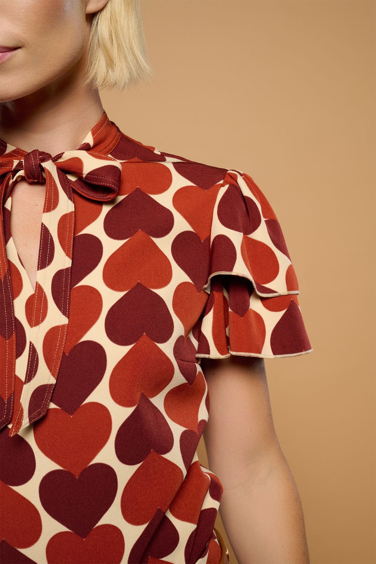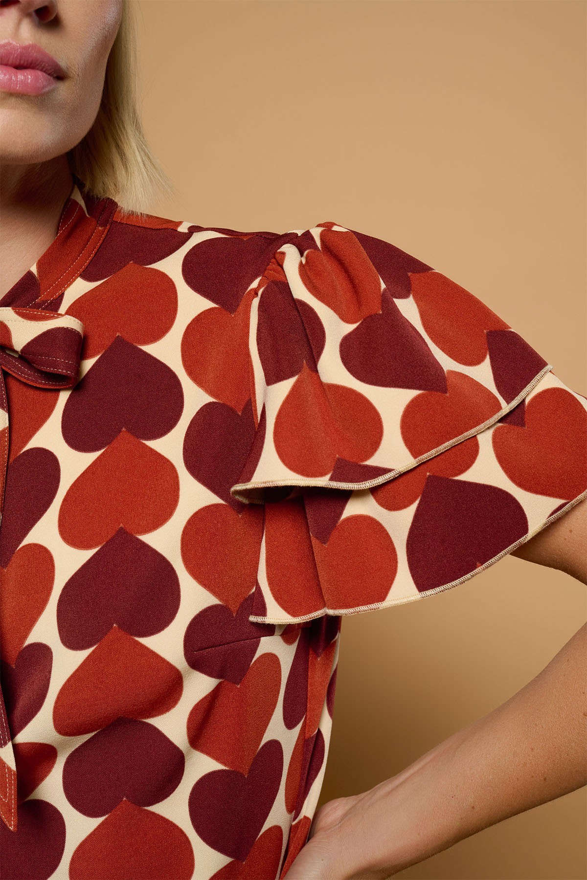 Blusa de cuello redondo con escote en lágrima con lazada. Manga corta con volantes. Estampado de corazones retro.