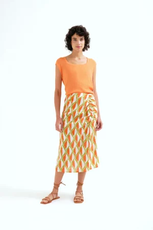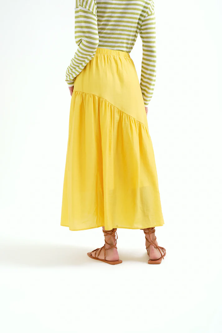 Falda larga de tejido crepé satinado de color amarillo. Cintura fija elástica de tiro alto. Detalle de corte asimétrico.Forro interior.