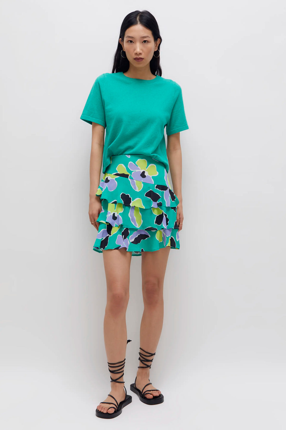 Falda corta en tejido crepe de viscosa con estampado floral Lassiandra. Con cintura fija de tiro alto. Modelo con distintas capas de volantes. Cierre lateral con cremallera invisible.