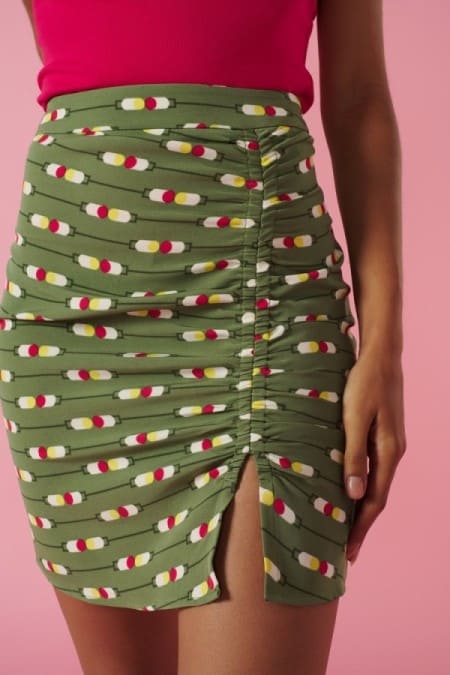 Falda corta con detalle fruncido delantero. Apertura lateral.