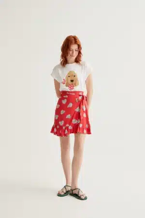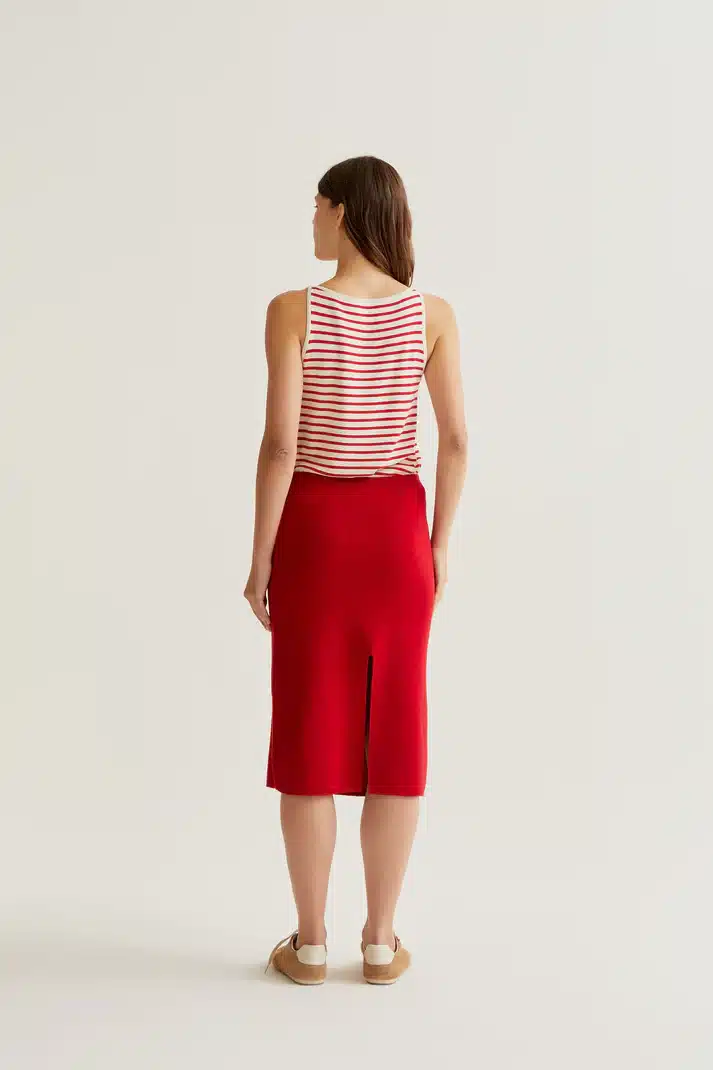 Falda midi con tejido punto de color rojo. Cintura fija elástica de tiro alto. Ligera abertura trasera.