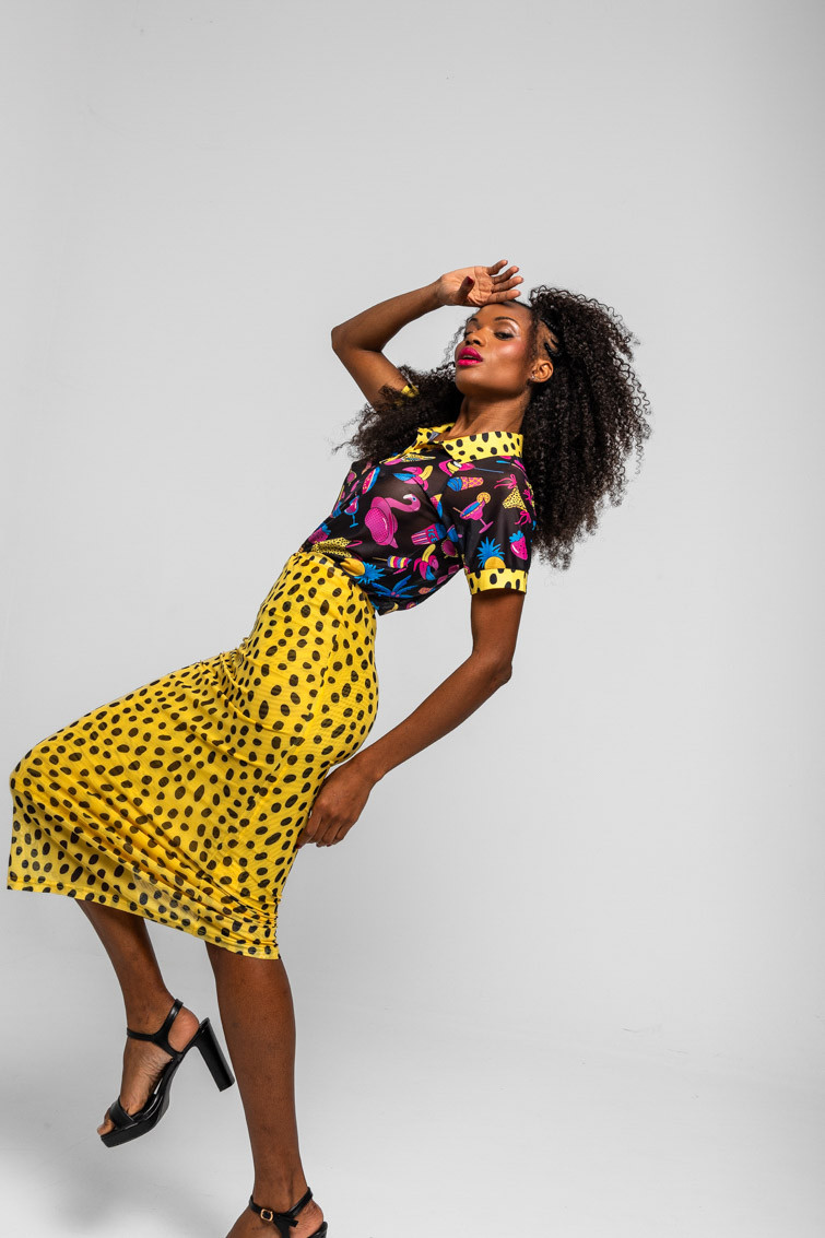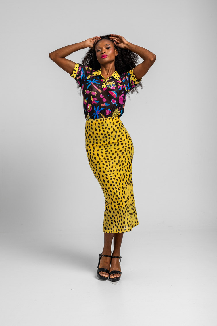Falda tul ajustada animal print amarillo y negro: Falda midi de tejido elástico. Modelo ajustado, con estampado vectorial.