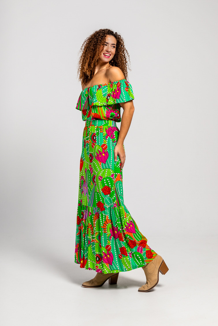 Falda volante larga: Falda larga en tejido fluido con estampado vectorial. Modelo con cintura elástica revestida en parte trasera y con maxivolante en el bajo.