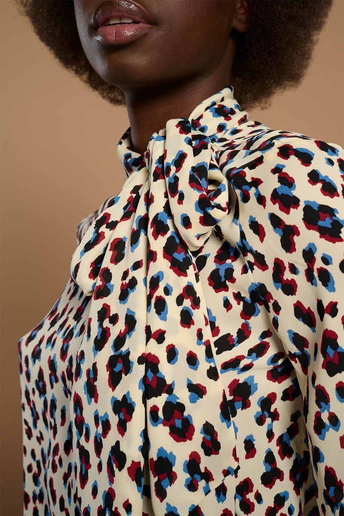 Blusa de cuello perkins y manga larga acabada en puño. Lazada lateral en cuello. Estampado animal print. Cierre con cremallera en hombro oculta en costura.