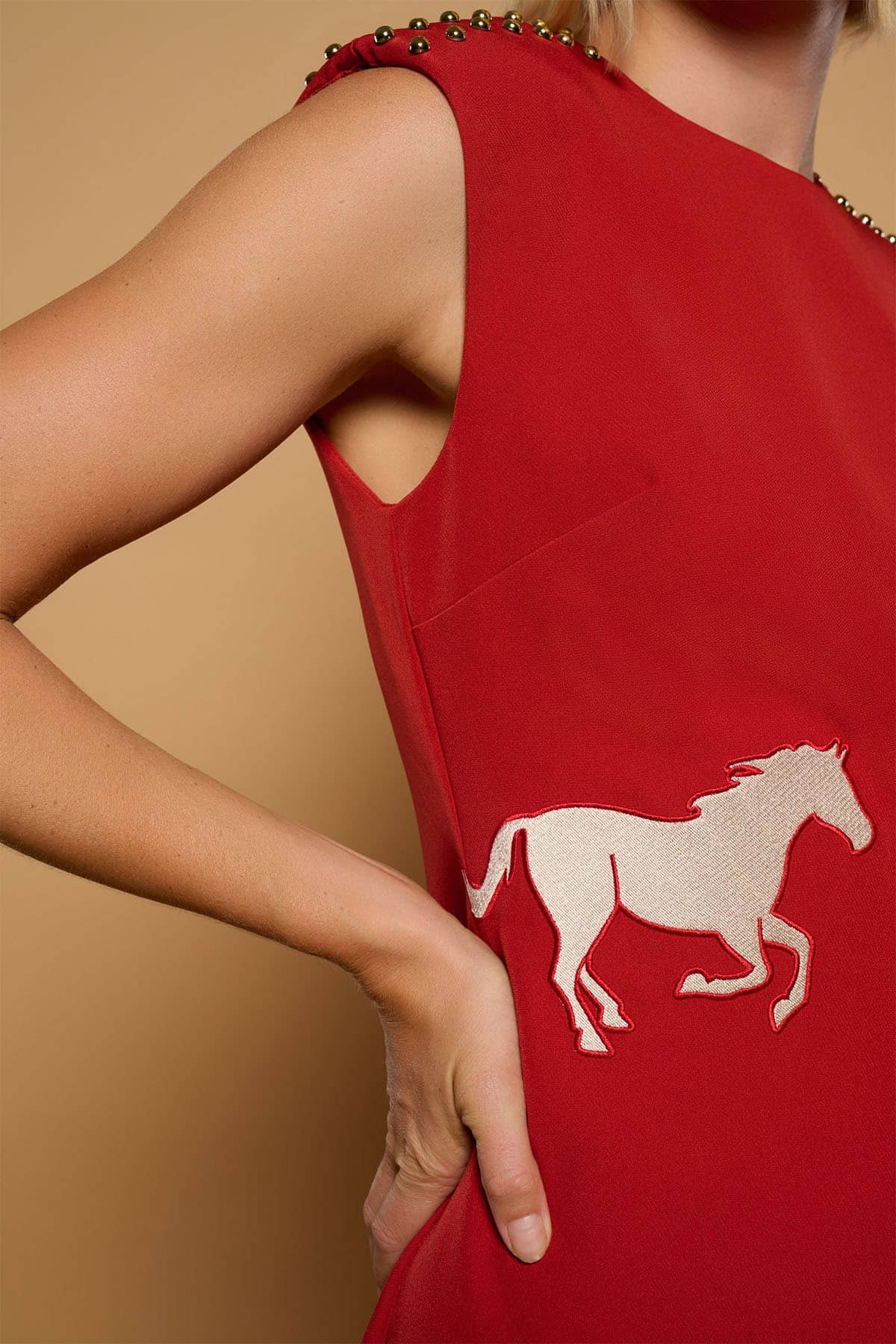 Vestido midi de cuello redondo y manga sisa con bajo asimétrico y silueta evasé. Detalle de tachuelas en hombreras. silueta de caballos bordados en cintura. Cierre con cremallera trasera.