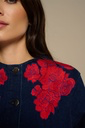 Vestido camisero denim con bordados de flores en rojo en hombros. Cierre con botones frontales.