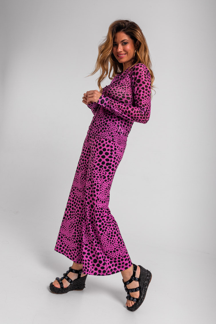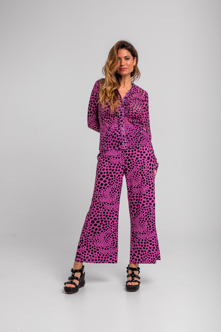 Pantalón flare elástico animal print rosa y negro: Pantalón de estampado vectorial de tiro alto y cintura elástica. Pierna ancha.