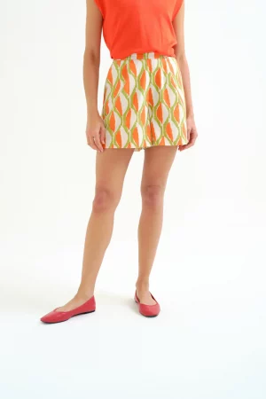 Pantalón fluido naranja y panteras rosas: Pantalón con pernera ancha de tela fluida. Cintura talle alto con goma ancha elástica en la parte trasera, cremallera lateral y bolsillos laterales.