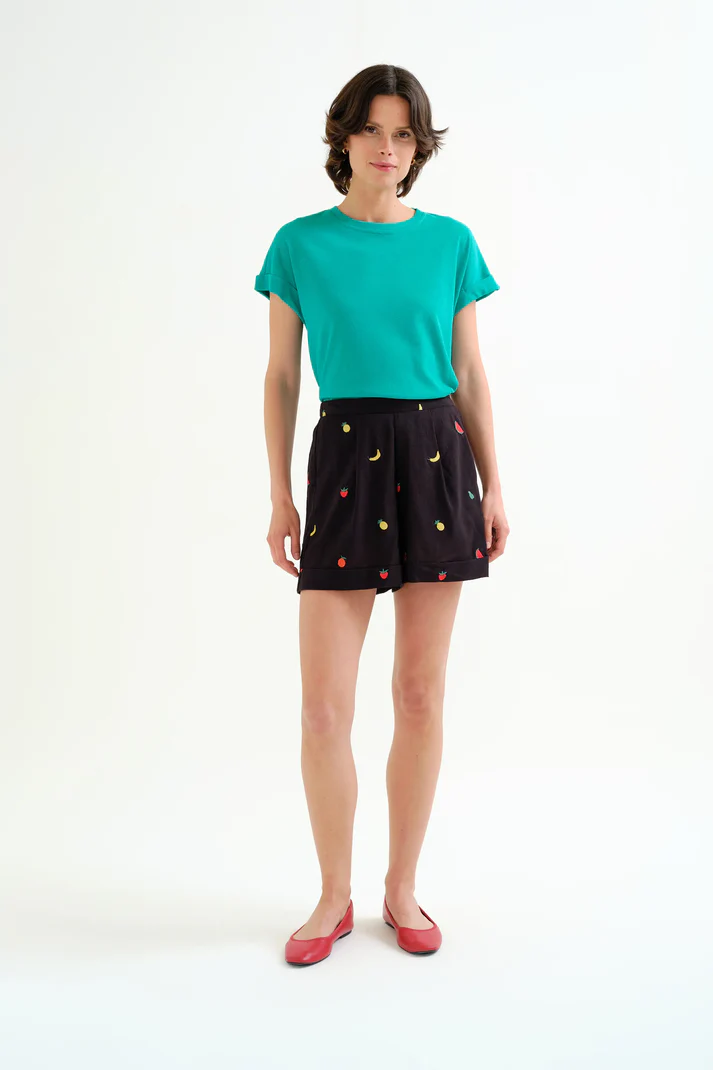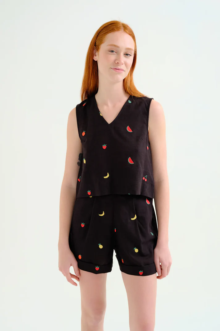 Shorts de tejido 100% algodón de color negro con bordado de ensalada de frutas. Cintura elástica de tiro alto. Pernera recta