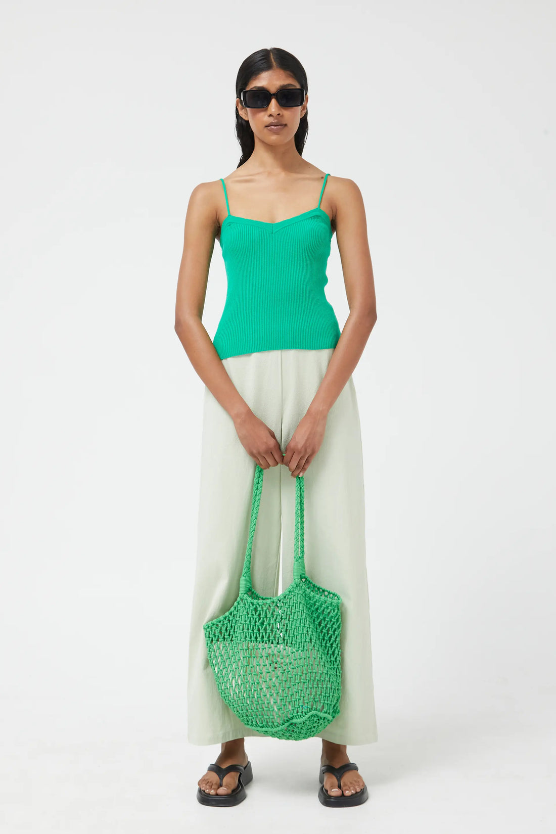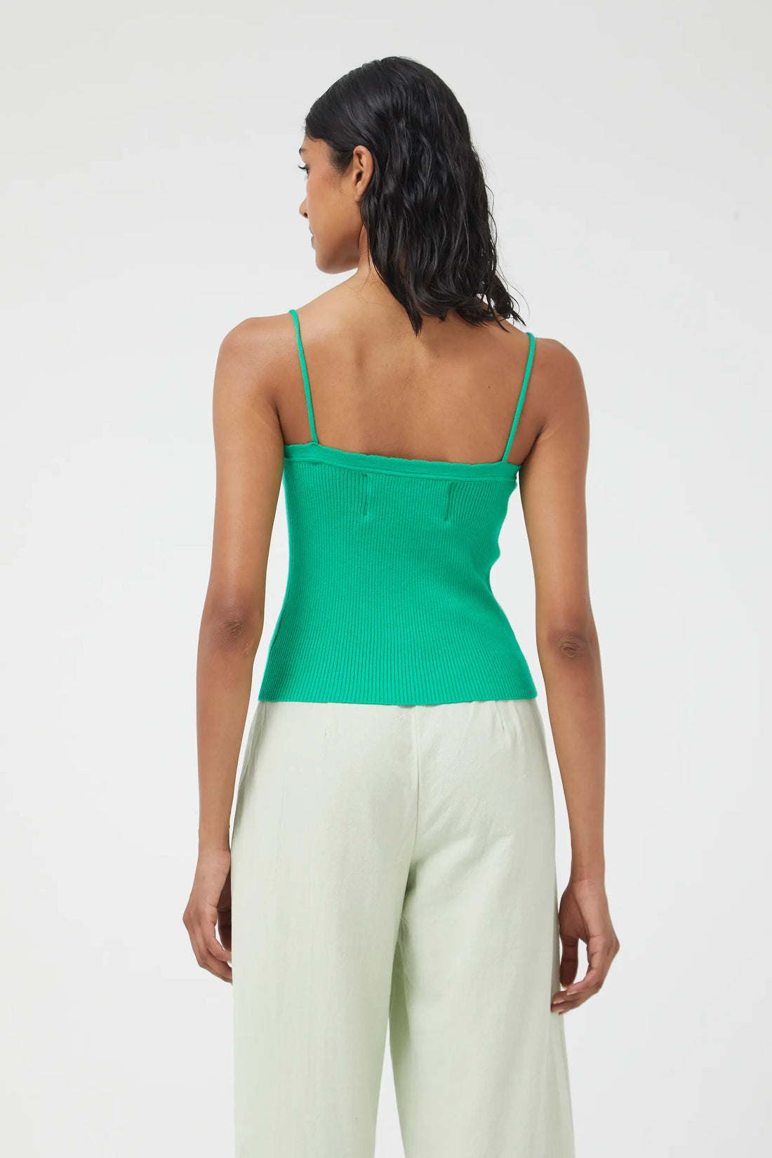 Top de punto canalé de color verde. Con escote pico y tirantes finos. Detalle de ribete en el pecho.