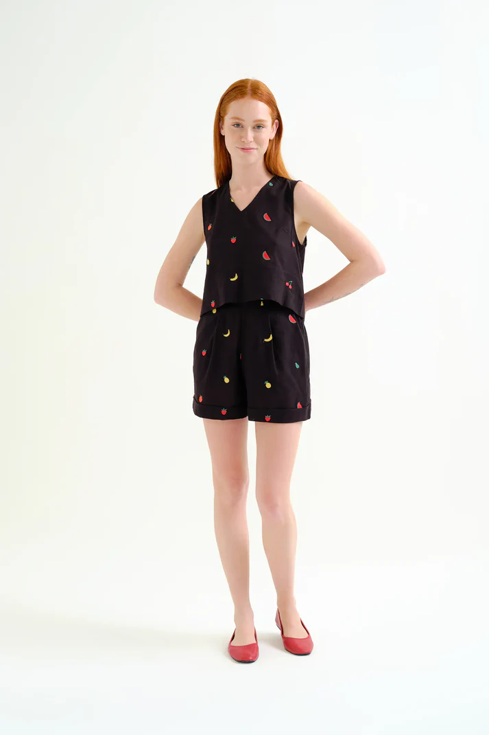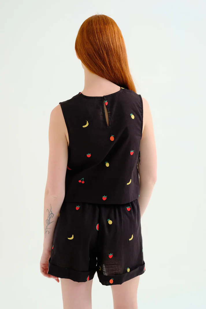 Top de tejido 100% algodón con estampado black gardener flowers. Cuello redondo y sin mangas. Cierre posterior con botón oculto