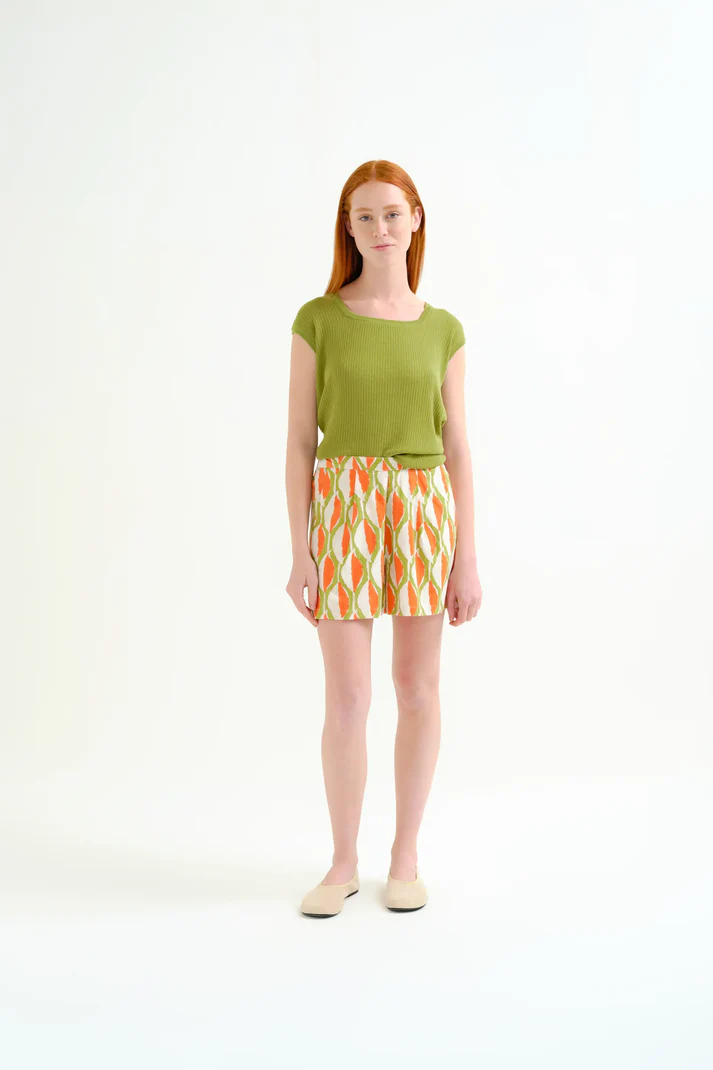 Top con tejido de punto fino de color verde. Escote cuadrado y manga corta. Detalles acabados en rib