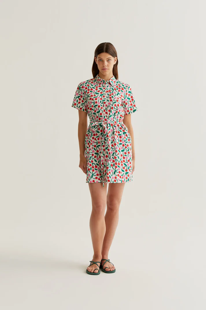 Vestido corto de tejido 100% algodón con estampado guinda. Cuello solapa y manga corta. Cierre frontal con botones de color blanco y cintura lazada.