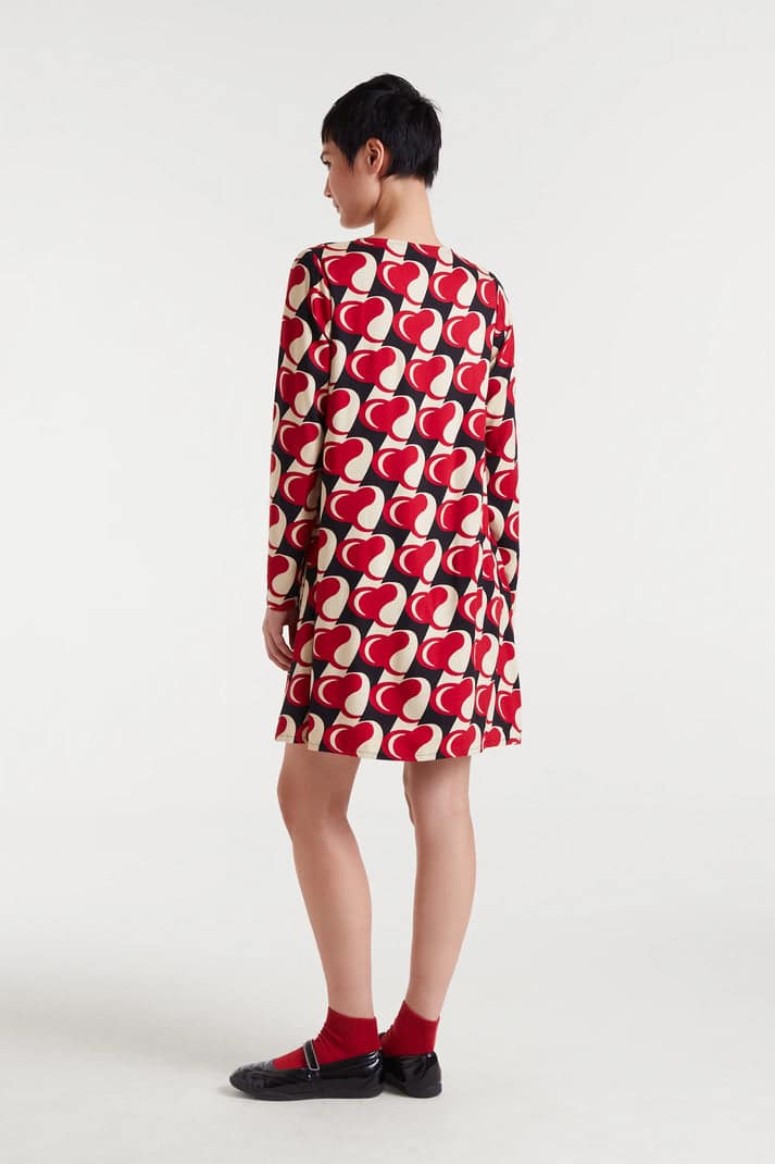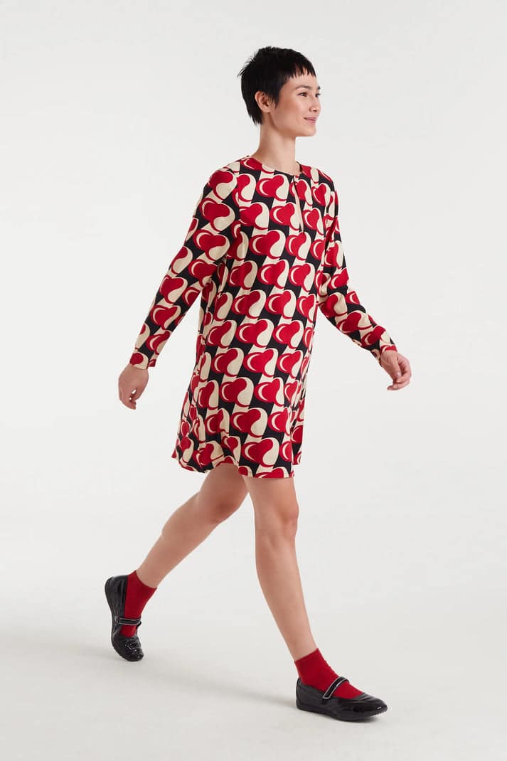 Vestido corto de tejido viscosa twill con estampado Heart Attack. Cuello redondo con escote pico cerrado con botón y manga larga. Bolsillos laterales.