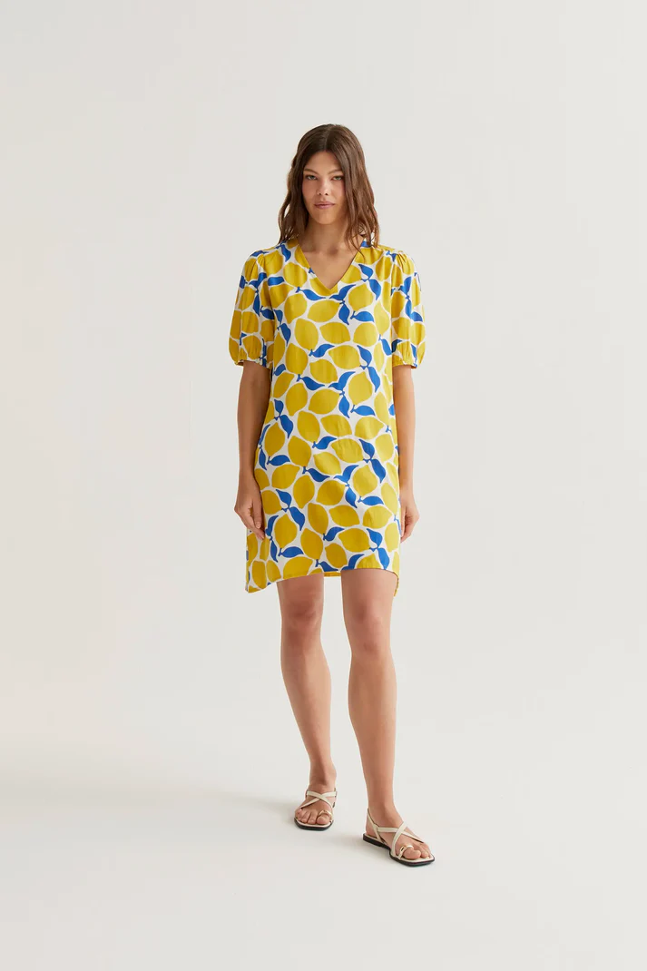 Vestido corto con estampado limoncello. Escote pico y manga 3/4 ligeramente abullonada terminada con ajuste elástico. Corte amplio.