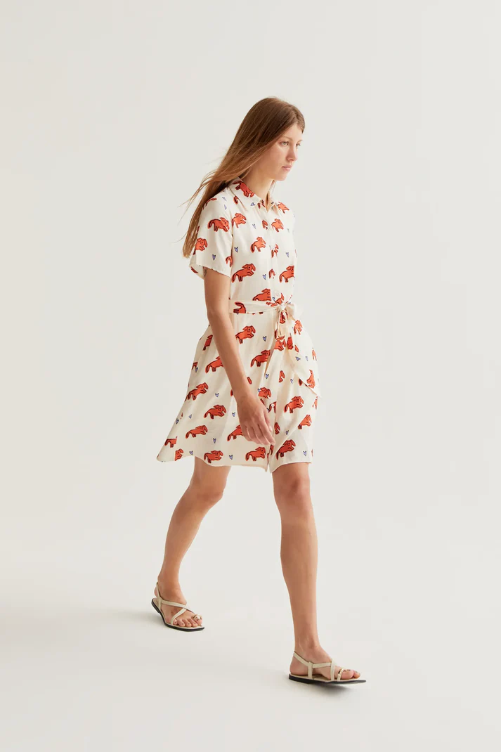 Vestido corto con tejido crepé ligero de estampado tochi. Cuello con solapa y manga corta. Cierre frontal con botones de color blanco. Cintura lazada.