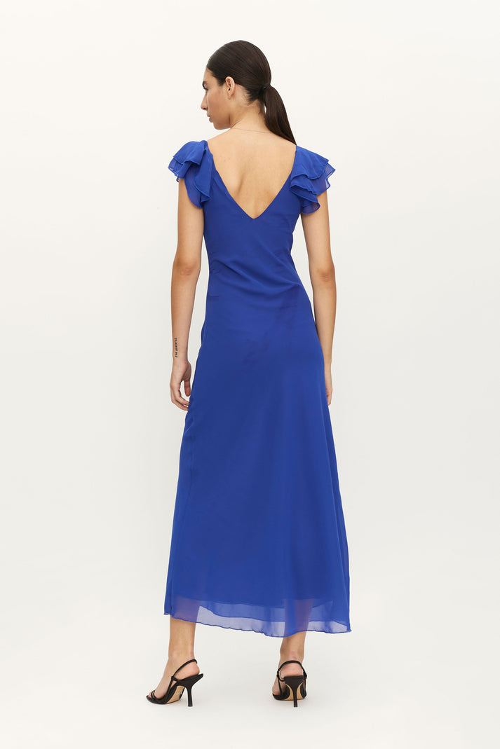VESTIDO LARGO DE GASA GRUESA CON ESCOTE EN PICO CON VOLANTES EN LAS MANGAS