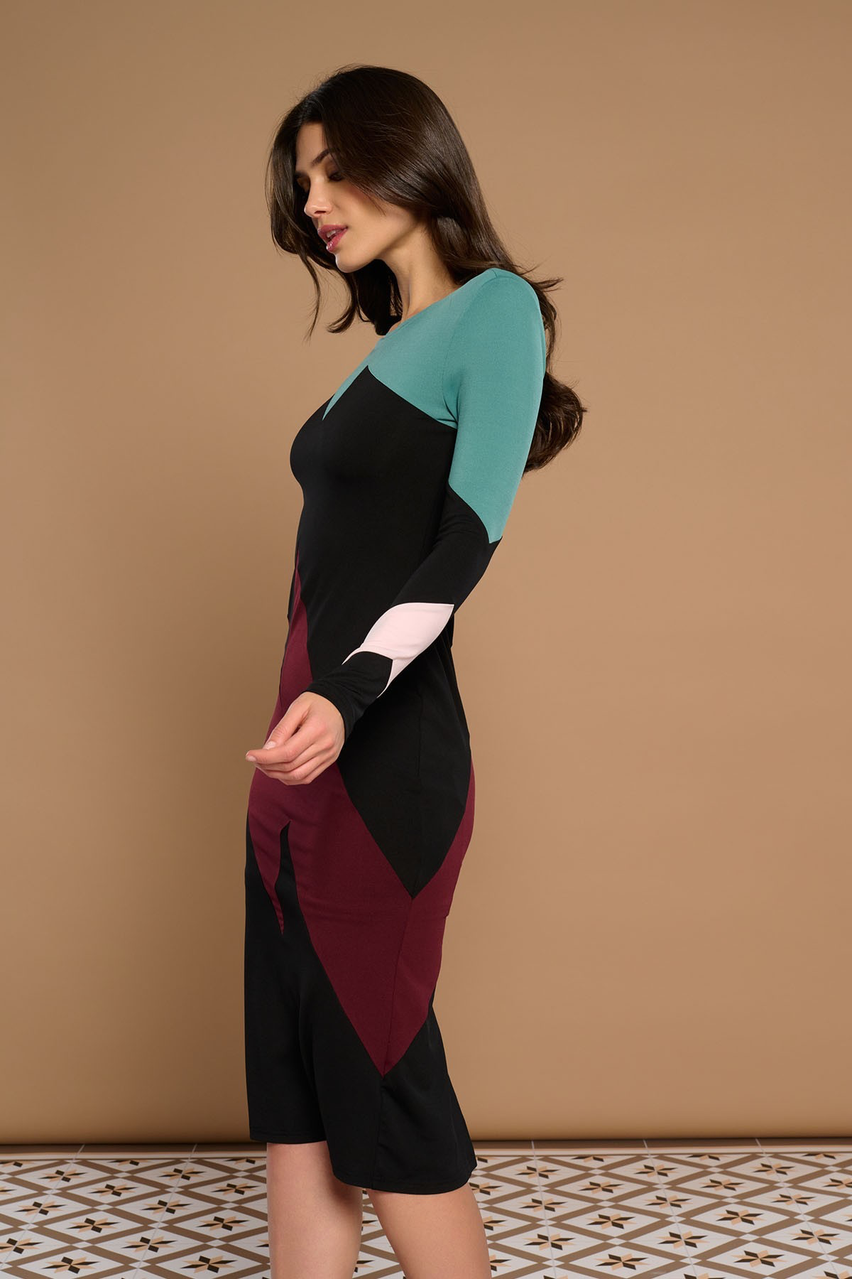 Vestido midi de cuello redondo y manga larga. Estampado de rayos color block. Tejido elástico. Forro interior elástico.