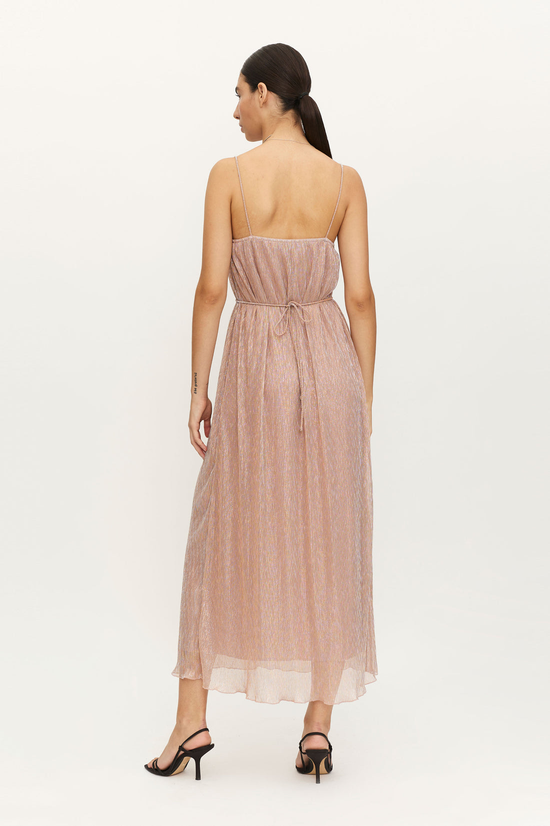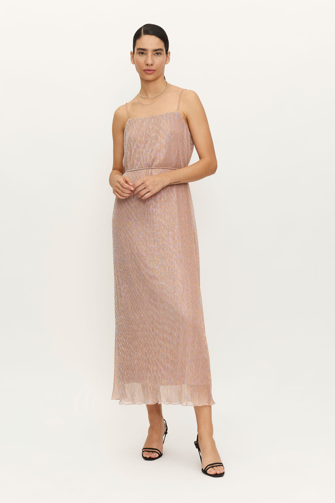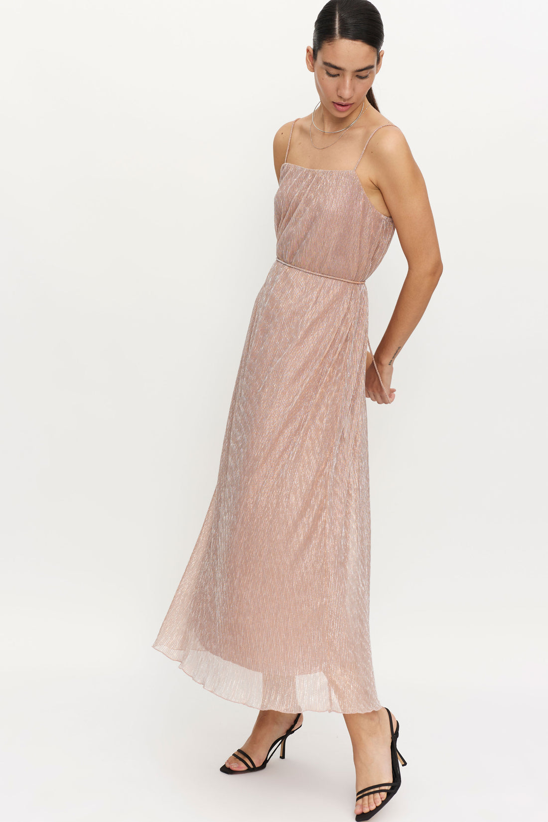 VESTIDO GASA ELASTICA CON BRILLO, CORTE A LA CINTURA, ESCOTE CUADRADO CON TIRANTES FINITOS