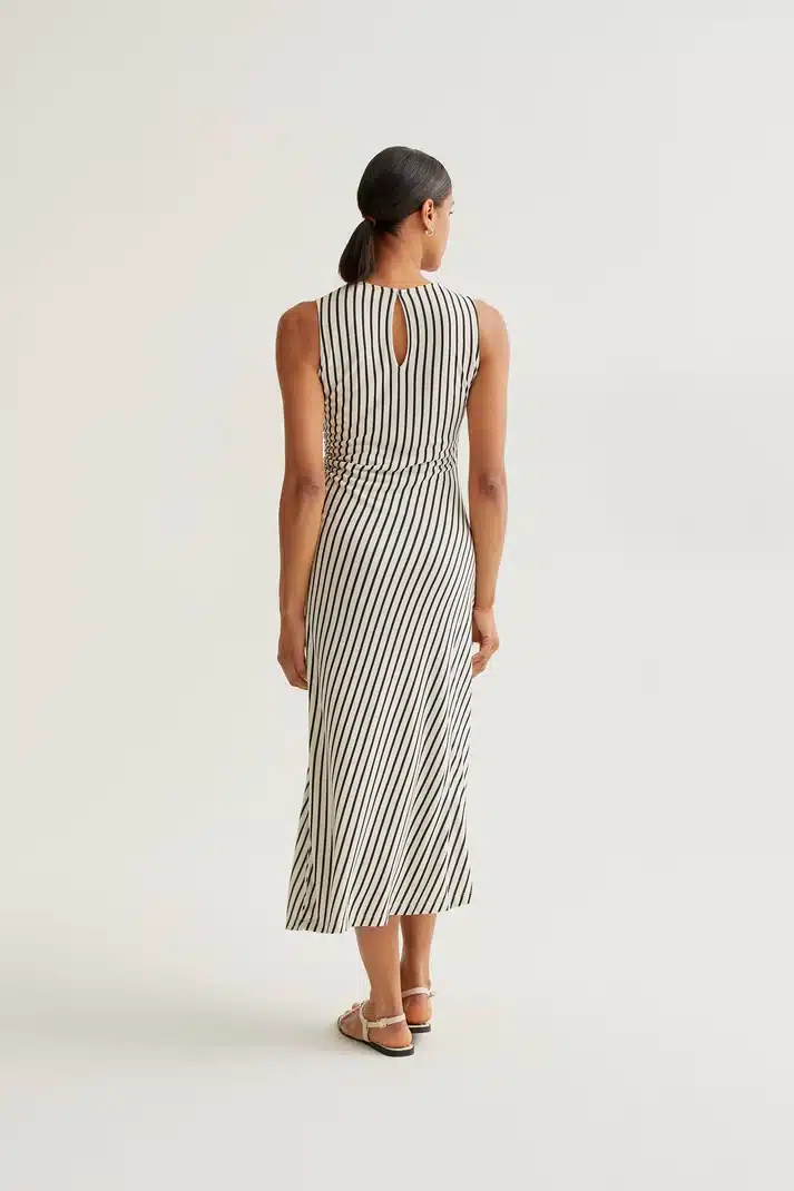 Vestido largo de tejido jersey viscoso con estampado de rayas de color negro. Cuello redondo y sin mangas. Cintura con detalle elástico.