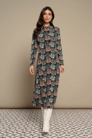Vestido largo con tejido punto estampado Potpourri. Con cuello mock y manga larga. Ligera abertura lateral.