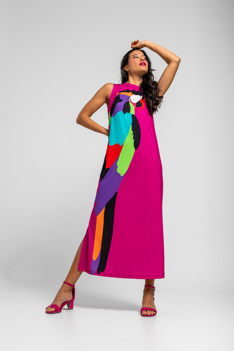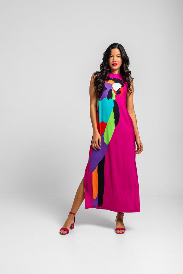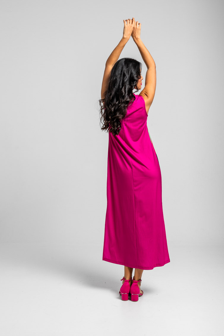 Vestido largo de corte recto, sin mangas, con escote redondo alto. Cierre en el cuello mediante botones en la espalda. Aberturas laterales en ambos lados que aportan comodidad y movimiento.