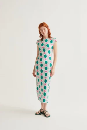 Vestido midi de cuello redondo y escoute cutout. Manga larga. Ajustado en cintura. Forro interior. Cierre en espalda con cremallera oculta en costura.