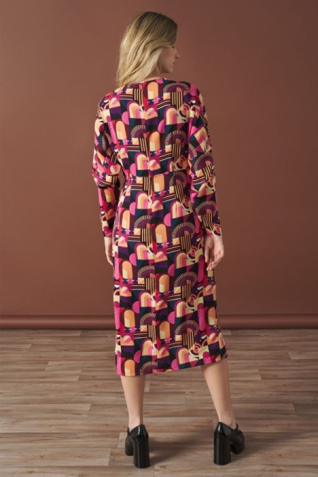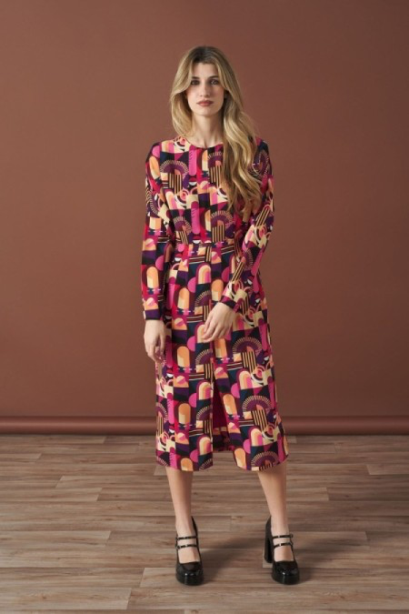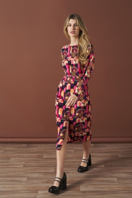 Vestido midi de cuello redondo y manga larga. Abertura frontal. Cremallera trasera oculta en costura. Forro interior.