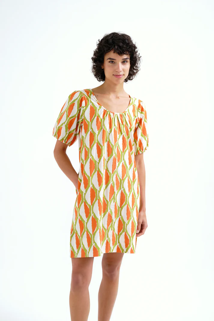 Vestido midi de tejido 100% algodón con estampado aloe. Cintura fija elástica de tiro alto. Abertura lateral. Forro interior.