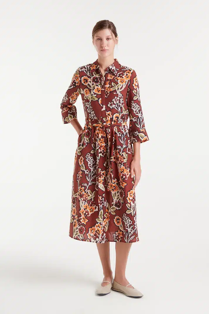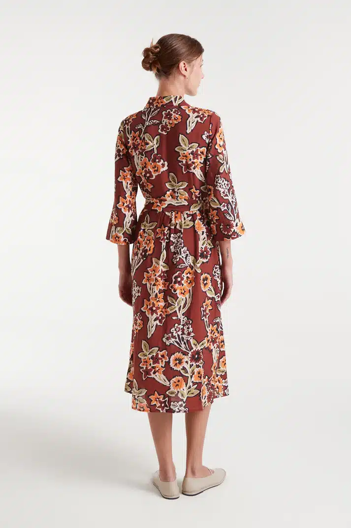 Vestido midi de crepé ligero con estampado Daisy. Cuello solapa y manga 3/4. Cierre frontal con botones ocultos y detalle anudado en la cintura. Bolsillos laterales.