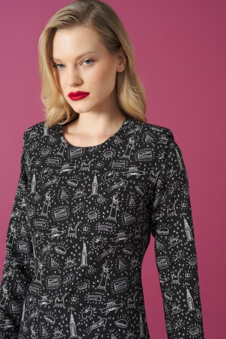Vestido ajustado de manga larga y cuello redondo. Estampado sketch urbano. Forro interior. Cierre con abertura y botón en espalda.