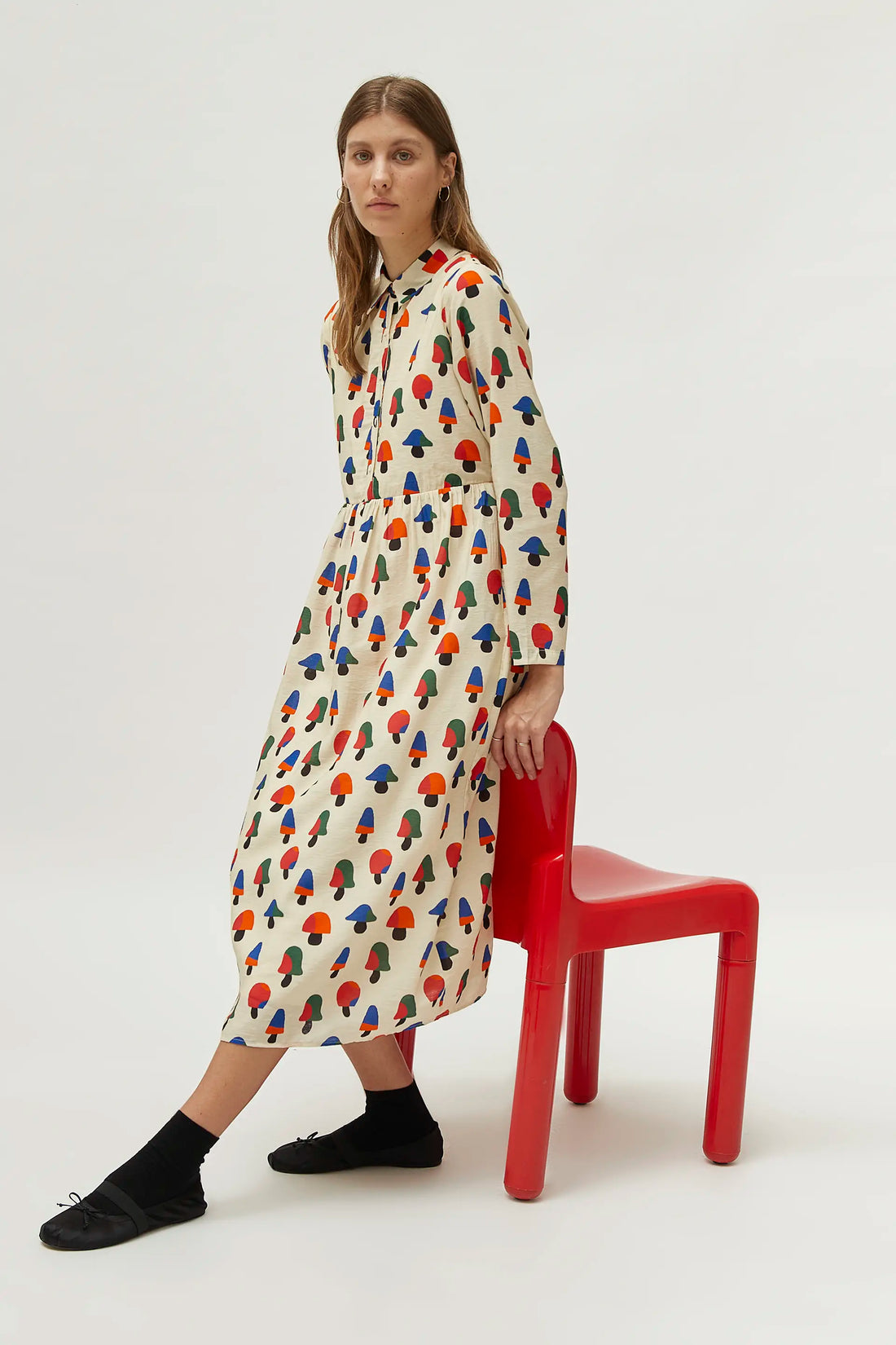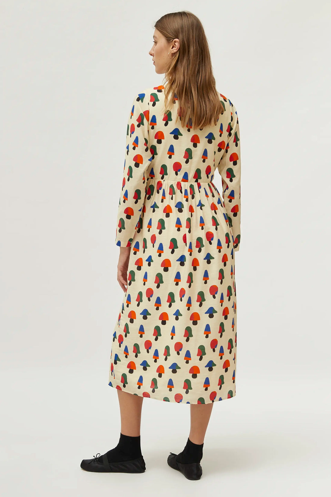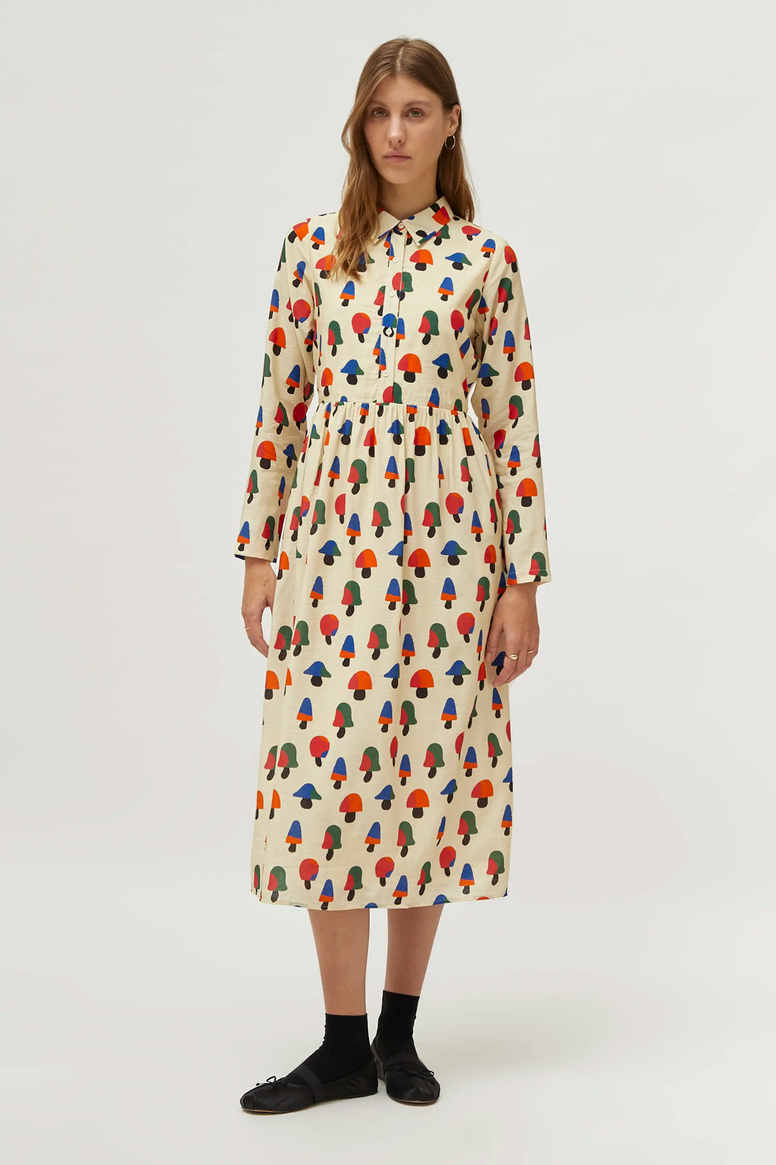 Vestido MIDI en crepé de viscosa de color beige con estampado de setas multicolor. Con cuello solapa y manga larga. Cierre frontal con botones y corte en la cintura.Forro interior.