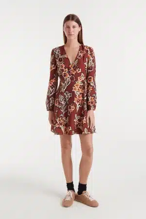 Vestido corto de escote en pico y manga larga con hombreras. Fruncido en laterales y efecto drapreado. Tejido de tul elástico. Forro interior elástico. Estampado de estrellas.