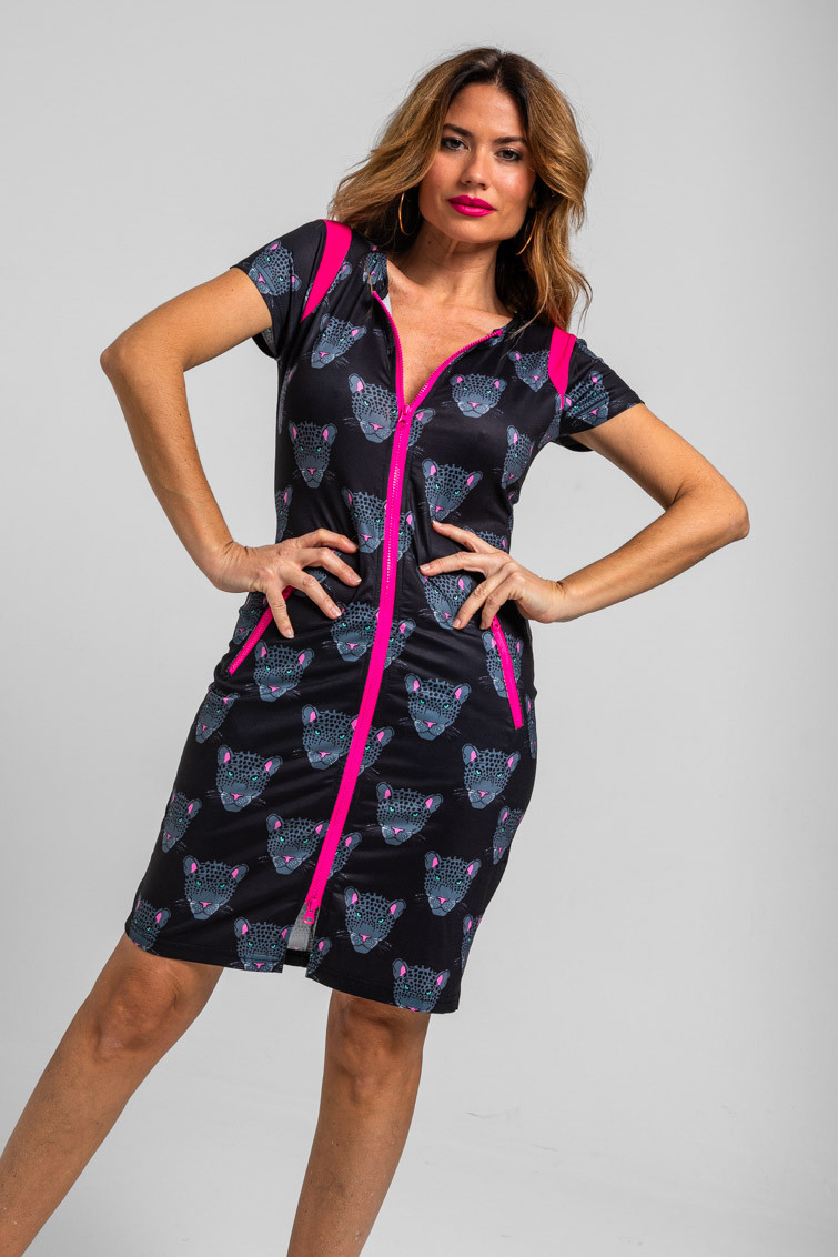 Vestido Tubo Cremalleras negro de panteras: Vestido de neopreno elástico entubado mini con estampado vectorial. Detalle de despiece en hombros, bolsillos con cierre de cremallera central en contraste