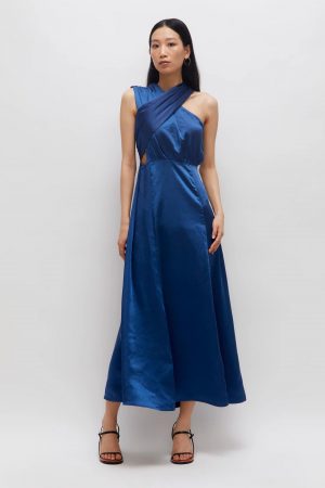 Vestid largo fiesta azul eléctrico escote cruzado